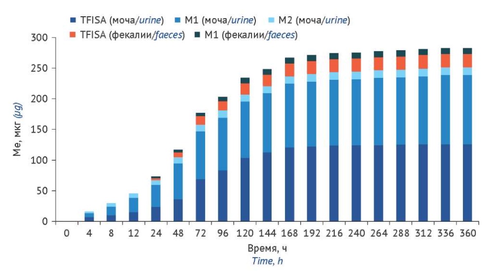 Процесс экскреции TFISA и его метаболитов ранее не изучался. Для данного исследования необходима более длительная продолжительность эксперимента, чем при изучении системной экспозиции и относительной биодоступности, так как в крайней точке (216 ч после введения препарата) концентрации TFISA и М1 в крови были выше предела количественного определения методики [4]. Продление эксперимента до 2 недель предположительно позволит наблюдать полную элиминацию TFISA из организма крыс.