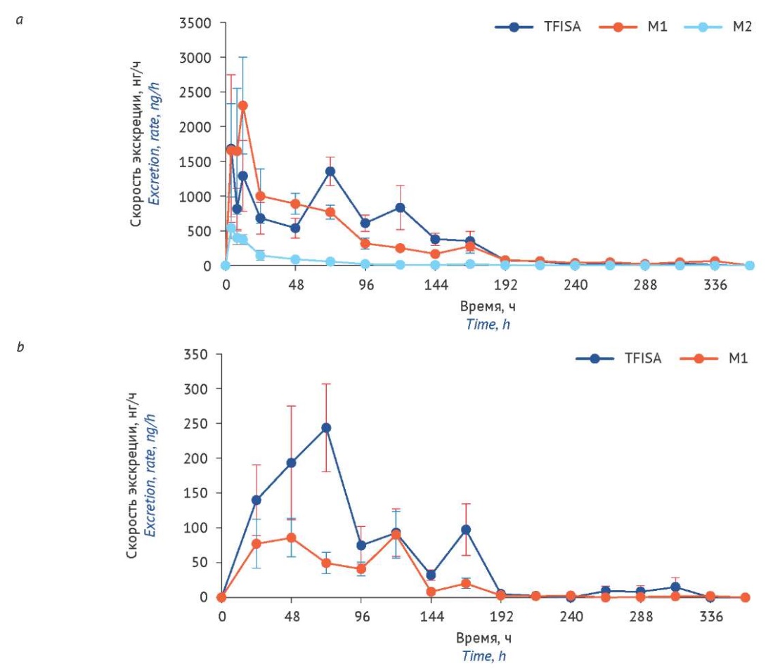 Установлено, что N-гидроксиметаболит выводится в основном через почки — 38,73±2,72% (М±SEM) от общего количества TFISA. Ме данного метаболита наступает спустя 336 ч эксперимента, как и для исходного изучаемого соединения. Наибольшая скорость ренальной экскреции M1 достигается в промежутке 8–12 ч после инстилляции глазной суспензии (рис. 3a), что соответствует периоду снижения его концентрации на фармакокинетических профилях в плазме и крови [3][4]. Динамика выведения М1 с калом (рис. 3b) была наиболее интенсивной в период 24–120 ч после начала эксперимента.