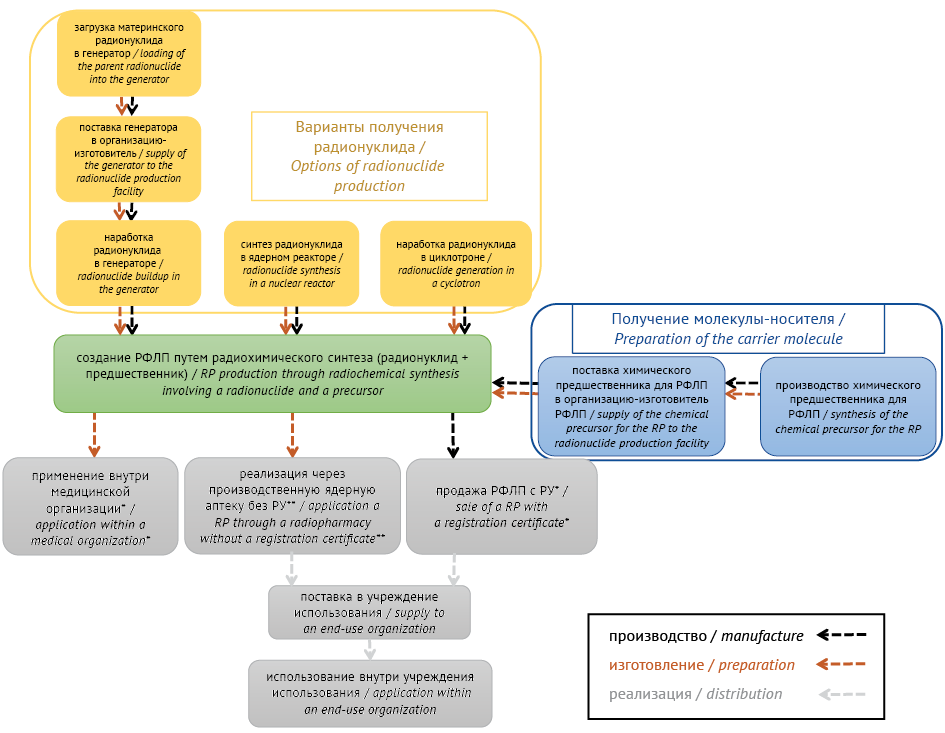 Рис. 2. Виды реализации радиофармацевтических препаратов (РФЛП) в Российской Федерации с учетом особенностей изготовления/производства. РУ — регистрационное удостоверение