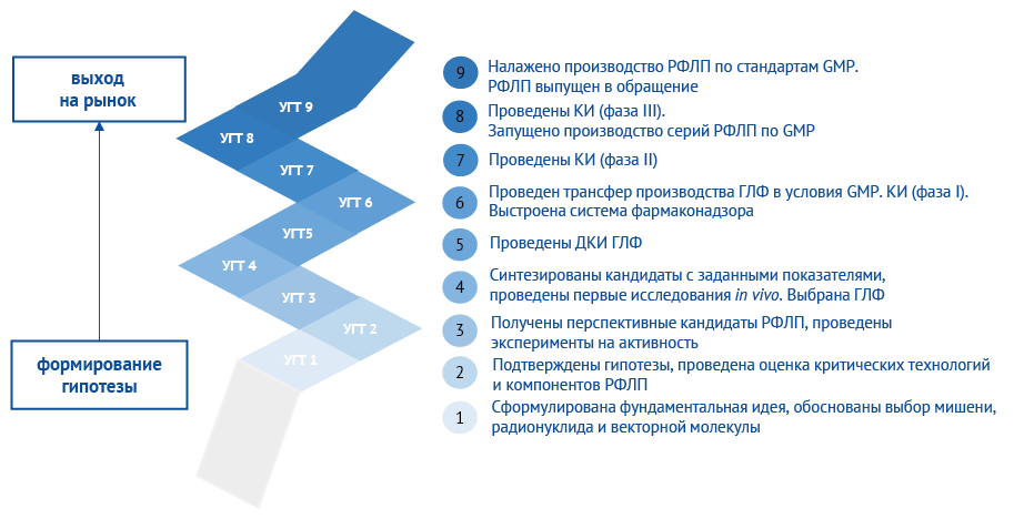 Таким образом, рассмотренная шкала УГТ для РФЛП учитывает основные нюансы разработки РФЛП вне зависимости от выбранной стратегии вывода препарата на рынок и является удобным и гибким инструментом в арсенале исследователей и заказчиков разработки, который позволяет как отслеживать прогресс исследования, так и минимизировать вероятные риски, избежать возможных дорогостоящих ошибок и ускорить вывод РФЛП на рынок, что положительно скажется на доступности современных методов диагностики и терапии для пациентов, а также будет способствовать развитию российской отрасли в целом.